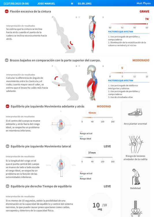 Grâce à Moti Physio, il est possible d’observer, quantifier et enregistrer les déséquilibres, compensations et altérations posturales qui apparaissent uniquement en dynamique —