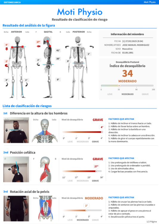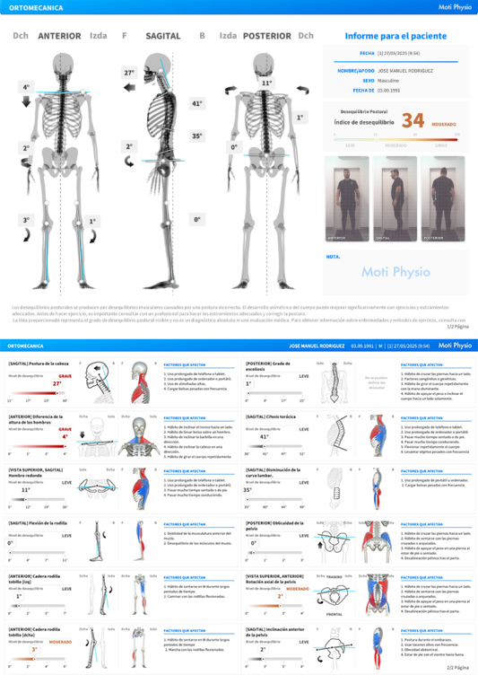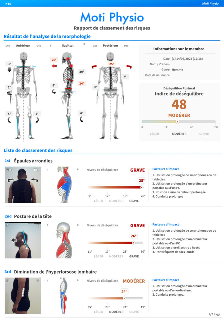 Grâce à son moteur d’analyse avancé, Moti Physio évalue 114 muscles en position statique, détecte les zones de tension ou de faiblesse et mesure l’alignement des structures clés : tête, colonne vertébrale et bassin. Le résultat : une cartographie claire et objective de la posture et de la santé musculosquelettique du patient.